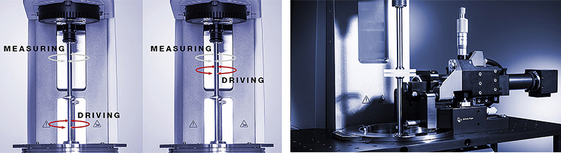 在反向運動模式下,流變儀將兩套空氣軸承 EC 馬達均用作驅(qū)動裝置和扭矩傳感器。兩個馬達可以輕松設(shè)置為以相反方向旋轉(zhuǎn),這可以用來在測量樣品中形成固定的停滯面,以便采用顯微鏡進行剪切條件下材料的先進結(jié)構(gòu)分析。此模式也可以與通用拉伸夾具結(jié)合使用,以便在最小的測量扭矩下進行拉伸測量。就速度而言,反向運動模式更讓測量工作“事半功倍” — 最高速度差高達 6000 rpm,這大大拓寬了高剪切應(yīng)用的剪切速率范圍。