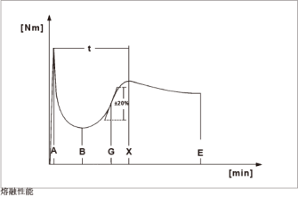 該軟件能夠分析曲線,并確定在轉(zhuǎn)矩曲線(用于測量粘度)、熱融合時(shí)間、凝膠速度和機(jī)械能輸入這三者中的極值。