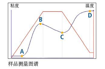 ① 糊化的開(kāi)始點(diǎn) (A)② 最高糊化粘度(B)③ 糊化溫度④ 恒溫段粘度(B-C)⑤ 最終冷糊粘度(D)