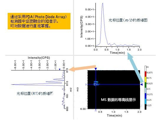 通過等高線顯示等可對整體的色譜洗脫模式進行確認(rèn)。與HPLC的DAD(二極管陣列)檢測器的解析畫面非常相似且簡單易懂的操作畫面,實現(xiàn)了與一般HPLC檢測器相同的操作性。