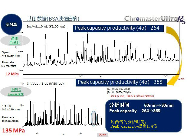 新型色譜柱(250 mm長(zhǎng)、填料粒徑1.9 µm)的理論塔板數(shù)和峰容量更高。該色譜柱可耐受的壓力更高,與填料粒徑5 µm的色譜柱相比(即使長(zhǎng)度相同),分析時(shí)間縮短一半,而峰容量提高了1.4倍。