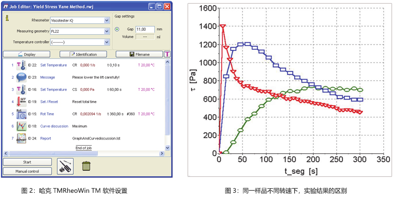 本文使用賽默飛 哈克Viscotester iQ智能流變儀配合 兩種4 葉片的槳葉式轉(zhuǎn)子(FL16 和 FL22)在通用夾持 器上通過控制速率模式進行實驗,轉(zhuǎn)子葉片直徑分別為 16 和 22 毫米,高度分別為8.8 和 16 毫米(圖1),儀 器轉(zhuǎn)速設(shè)置為0.05rpm。5 中市售醬類產(chǎn)品分別使用不 同的轉(zhuǎn)子,采用相同的實驗參數(shù)進行測試。將產(chǎn)品容器 蓋子打開,直接放置在通用夾持器上面。利用手動控制 升降功能和哈克 TMRheoWinTM 軟件設(shè)置(圖 2)以保證 轉(zhuǎn)子保持靜止,然后垂直的將轉(zhuǎn)子插入到具有高度重復(fù) 性的測量位置。實際經(jīng)驗表明,較硬的產(chǎn)品在生產(chǎn)線上 以較高的速度罐裝時,產(chǎn)品在容器內(nèi)的不同區(qū)域可能表 現(xiàn)出不一樣的性質(zhì)。因此每次實驗都必須保證槳葉轉(zhuǎn)子 在產(chǎn)品容器中的位置是相同的,以確保測試結(jié)果的重復(fù) 性和可靠性。當樣品經(jīng)過短暫的平衡和恢復(fù)后,測試時 間被重置為 0。然后設(shè)置一個非常低轉(zhuǎn)速(0.05rpm), 旋轉(zhuǎn)的時間以及在此時間段內(nèi)所需要的數(shù)據(jù)點的數(shù)量。 最后可以加入數(shù)據(jù)自動評估的設(shè)置以及生成實驗報告。 實驗報告可以保存為多種格式(比如 pdf,jpeg,tiff 等) 或者直接由打印機輸出。對于每一類樣品,都需要進行 簡單的預(yù)實驗來確定最合適的轉(zhuǎn)子型號。比如較小尺寸 的轉(zhuǎn)子適合測試具備較高屈服應(yīng)力的樣品,比如花生醬; 而尺寸大的轉(zhuǎn)子則適用于測試低粘度、低屈服應(yīng)力的樣 品,例如巧克力醬,果醬或者蛋黃醬 [7]。為了確定合適 的轉(zhuǎn)速,則需要進行多種轉(zhuǎn)速的實驗。轉(zhuǎn)速太高則會在 曲線上形成一個難以計算的尖峰(圖3中紅色三角形),轉(zhuǎn)速太低則會產(chǎn)生漸進型的曲線(圖3 綠色圓圈)。而 我們的目的是選擇一個合適的轉(zhuǎn)速,使得實驗曲線具有 一個可以評估的最大值(圖3 藍色長方形)。前期實驗 證明,0.05rpm 的轉(zhuǎn)速是最適合這些樣品的。
