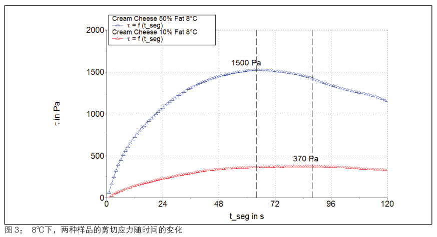 彈性響應(yīng)后,其結(jié)構(gòu)遭到破壞并且剪切應(yīng)力開始下降。實驗結(jié)果中剪切應(yīng)力在整個測試時間內(nèi)的最大值就對應(yīng)了樣品的屈服應(yīng)力。圖 2 是兩種樣品在室溫下的測試結(jié)果,可以看出,脂肪含量高的樣品的屈服應(yīng)力為 1000Pa,而低脂肪含量樣品的屈服應(yīng)力則為210Pa。而圖 3 則是兩種樣品在較低溫度下(8℃)的結(jié)果,相當(dāng)于樣品剛從冰箱內(nèi)取出的溫度。其結(jié)果表明高、低脂肪含量的樣品在此溫度下的屈服應(yīng)力都有所上升,分別為 1500Pa 和 370Pa。結(jié)合上述結(jié)果,當(dāng)考慮將此類食品涂抹在某些剪切模量低至1200Pa 白面包上時就會出現(xiàn)問題,因為在冷藏條件下的奶油奶酪的屈服應(yīng)力遠(yuǎn)大于面包所能承受的剪切模量。