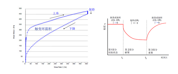 觸變性是膠黏劑的一個(gè)很重要的特性,一般的理解是與時(shí)間相關(guān)的行為,可以考察膠黏劑在使用過(guò)程中的流平與垂掛性能。左圖觸變環(huán)實(shí)驗(yàn)表明樣品觸變性的大小,右圖三段式模擬樣品靜止 - 破壞 - 靜止整個(gè)過(guò)程的粘度變化,反應(yīng)其流平和垂掛性能。