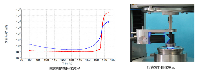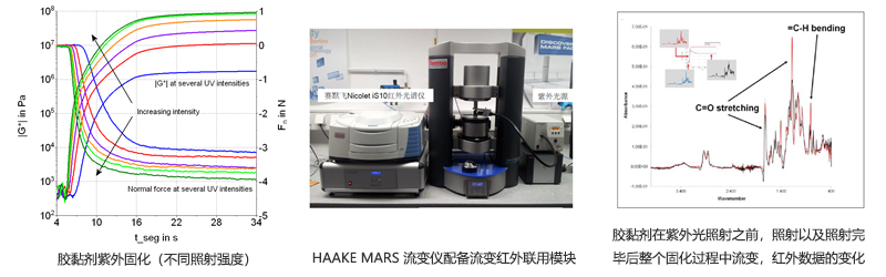 流變儀可以通過(guò)測(cè)試樣品粘彈性模量的變化全程監(jiān)測(cè)膠黏劑樣品的固化過(guò)程,包括熱固化和紫外固化,再配個(gè)哈克流變儀專利的流變 - 紅外聯(lián)用模塊,更可深入研究固化過(guò)程中樣品分子層面的變化,監(jiān)控反應(yīng)動(dòng)力學(xué),反應(yīng)度。