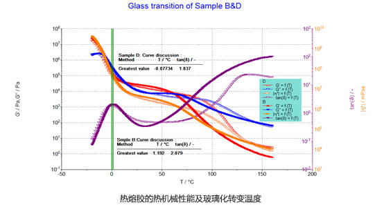 熱機(jī)械性能也是表征膠黏劑使用性能的重要參數(shù),通過(guò)測(cè)量樣品粘彈性隨溫度的變化,可以進(jìn)行詳細(xì)準(zhǔn)確的表征,并可以計(jì)算其玻璃化轉(zhuǎn)變溫度。