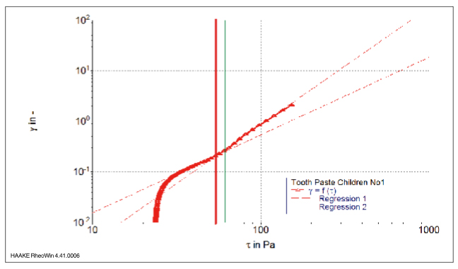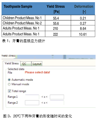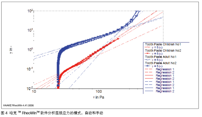 成人及兒童牙膏的測(cè)試曲線在圖3 中顯示。每個(gè)樣品進(jìn) 行了兩次實(shí)驗(yàn),表現(xiàn)出極高的重復(fù)性。樣品的屈服應(yīng)力 總結(jié)在表 1 中。與預(yù)期的一樣,兒童牙膏的屈服應(yīng)力大 約為55Pa 左右,比成人牙膏的215Pa 低很多。哈克 TM RheoWinTM 軟件提供了兩種屈服應(yīng)力分析模式,自動(dòng)和 手動(dòng)(圖4)。當(dāng)儀器不連接軟件時(shí),則只可以使用自動(dòng)分析模式。手動(dòng)模式進(jìn)行分析在可以更加靈活的來(lái)進(jìn) 行準(zhǔn)確的數(shù)據(jù)評(píng)估。通常用來(lái)評(píng)估屈服應(yīng)力的數(shù)據(jù)范圍 可以通過觀察直接得到,如表 1 中所顯示結(jié)果。但是屈 服應(yīng)力往往依賴于樣品準(zhǔn)備,測(cè)試過程以及評(píng)估方法。 圖 5 就給出了對(duì)于兒童牙膏才去自動(dòng)模式和手動(dòng)模式獲 得的結(jié)果的區(qū)別。