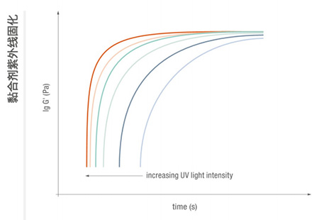 可應(yīng)用不同紫外光強度以顯示對印刷油墨紫外線固化的影響:應(yīng)用的紫外光強度越高,固化過程進(jìn)展越快,且樣品的最終硬度(G')越高。