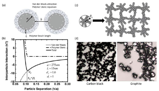 圖3 顆粒間的膠體相互作用和顆粒的組裝行為。(a)炭黑顆粒的聚合物涂層和顆粒間膠體相互作用的示意圖。(b)包覆了PVDF的兩個炭黑顆粒之間的典型顆粒間作用力。(c)組裝成二次聚集體的初級炭黑顆粒的示意圖,這些聚集體連接成網(wǎng)絡(luò)。(d)炭黑(左)和石墨(右)顆粒的光學圖像。