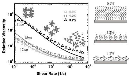 吸收在炭黑顆粒表面的聚合物形態(tài)會隨著顆粒表面可用空間而變化。當炭黑體積分數(shù)較低時,總的顆粒表面積更少,吸附在表面的聚合物量更多,聚合物鏈伸展打開。但是當碳黑顆粒體積分數(shù)高時,例如3.2%,炭黑表面上有足夠的空間容納PVDF,并允許PVDF聚合物鏈保持卷曲的形態(tài)。PVDF聚合物處于“松弛”結(jié)構(gòu),較高濃度的炭黑顆粒導致聚合物長度越小。而兩個炭黑顆粒之間的最大吸引力取決于吸收的聚合物層的厚度,因為當顆粒間表面到表面距離達到2L時,非常強的聚合物空間位阻斥力超過范德華吸引力,起主導作用。對于較小的聚合物層厚度,兩個顆粒會變得更近,從而產(chǎn)生更強的顆粒間范德華吸吸引力。因此,隨著炭黑顆粒的體積分數(shù)從0.9%增加到3.2%,粘度急劇增加。