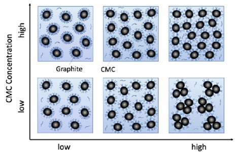對于石墨、CMC和水體系,微觀機制類似。如圖5所示,當CMC濃度低(圖5的下部)和低石墨濃度時,顆粒表面吸附足夠量的CMC,抑制石墨顆粒的聚集。隨著石墨濃度的增加,每個石墨顆粒吸附的CMC量減少(圖5下中心),顆粒之間的相互作用減弱,低剪切速率區(qū)域的粘度降低,高剪切速率區(qū)域出現(xiàn)剪切增厚。石墨濃度的進一步增加會導致每個顆粒上吸附的CMC量進一步減少,使得石墨顆粒之間的相互作用減弱并發(fā)生聚集(圖5右下角),導致粘度增加和數(shù)據(jù)波動。在CMC濃度升高時(圖5上部),即使石墨濃度較高,也能有足夠的CMC被吸附在石墨表面,分散石墨顆粒。因此,粘度不會顯著增加,并且在高剪切速率范圍內(nèi)也抑制了剪切增稠。分子量最高的CMC提供了更強的空間位阻相互作用,因此對粘度和剪切增稠的影響更大。