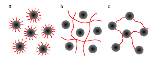 聚合物與顆粒的相互作用,除了包覆(圖6a)之外,還包括(b)粘結(jié)劑相成三維網(wǎng)絡(luò)結(jié)構(gòu),空間位阻作用阻止顆粒的團聚;(c)粘結(jié)劑與活性物質(zhì)顆粒表面鍵合作用,將顆粒之間連接在一起,這是漿料形成凝膠結(jié)構(gòu),粘度比較高。