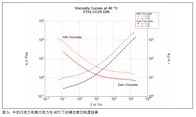 當圓筒轉(zhuǎn)子的上部到達測量位置后,樣品保持一個 靜止的狀態(tài)。在這個時間里,任何由于加樣或者或 者夾具閉合帶來的外力作用都會得到松弛,同時樣 品也會到達測試溫度。程序的最后(步驟11-13) 是數(shù)據(jù)評估部分,由RheoWinTM 軟件自動進行。 通過傳統(tǒng)的卡松模型或者Windhab 模型[3] 可以來 計算巧克力融體的屈服應(yīng)力. 而 Servais [4] 提供了 一個更為簡便的方法,就是用剪切速率為5s-1 下 的剪切應(yīng)力作為其屈服應(yīng)力。如果采用這種方法, RheoWinTM 軟件也可以自動進行插值計算。 同樣,本報告中也給出了兩種樣品在 40℃下的穩(wěn)態(tài) 剪切實驗結(jié)果。相對于瞬時粘度數(shù)據(jù),穩(wěn)態(tài)剪切粘 度不取決于時間依賴效應(yīng)或者剪切速率變化斜率。