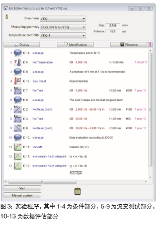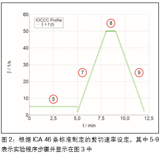 按照 ICA 第 46 條標準制備了兩種巧克力樣品,一種是牛 奶巧克力,另一種是黑巧克力。將兩種樣品切成片,放 進密封的玻璃容器中,然后將玻璃容器在 52℃的爐子中 放置45-60 分鐘。同時,將測量杯和轉(zhuǎn)子在Viscotester iQ 的帕爾貼溫控單元中預(yù)加熱到 40℃。 這個實驗中采用的測量夾具為CC25 DIN Ti(直徑 25mm 鈦合金同軸圓筒). 這個小尺寸同軸圓筒體系只 需要 16.1 毫升的樣品,而且可以很容易的拆卸及清理。 測試方法按照ICA 第 46 條標準轉(zhuǎn)換成賽默飛 TM 哈克 TM RheoWinTM軟件的標準程序。剪切速率范圍見圖2所示。 哈克 TM RheoWinTM 程序(圖 3)包三部分內(nèi)容:樣品條 件,測試及評估。樣品條件應(yīng)該始終保留在程序序列中, 以防止忘記并保證所有測試都按此條件進行從而保證測 試結(jié)果的重復性。在測試條件這一部分中(步驟 1-4),