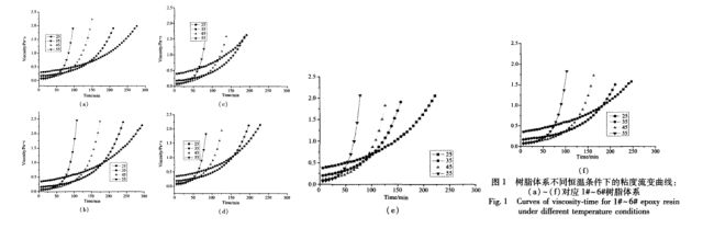 測試 RIMR 035c樹脂體系在 25℃ 、35℃ 、45℃ 、55℃恒溫條件下的粘度 , 圖 1(a)、圖 1(b)、圖 1(c)、圖 1(d) 、圖 1(e)、圖 1(f)分別 為 1#-6#環(huán)氧樹脂體系在 25~55℃不同恒溫條件下的實測 粘度曲線。 在
