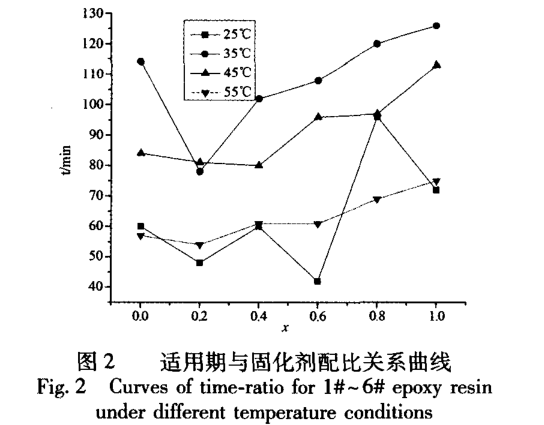 圖2為 25℃ 、35℃ 、45℃ 、55℃ 下適用期與固化劑配比的關系曲線。