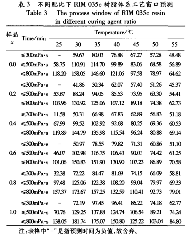 將擬合獲得的參數(shù)方程代 回實際曲線的擬合模型,模型中僅剩未知變量粘度 、溫度和時間 。 通過上述非常 規(guī)的二次 曲線擬合方法 , 獲得該環(huán)氧樹脂體系的等溫粘度與溫度和時間 的關系 。 本文以 300mPa?s、500mPa?s、800mPa?S三點為分界點,根據(jù)模型計算不同溫度下該樹脂體系從初始粘度上升至這三個粘度點所需要的時間,即為工藝窗口,如表 3所示 。