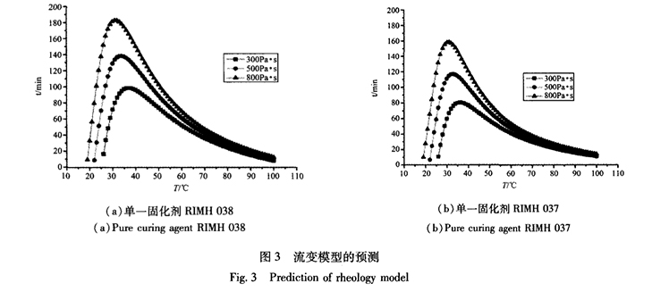 從表 3 中可以看出,同一配比下,達到同一目標粘度的時間 隨溫度升高先增加再降低 ; 而同一溫度下,隨著固化劑RIMH?。埃常负康脑黾?,達到目標粘度的時間先降低再升高。x=0.0 時 ,最長適用期為114. 7min,對應溫度為 35℃;x=1.0時,最長適用期為 137. 88min,對應溫度為35℃。 說明預測模型的變化規(guī)律與實驗測試結果吻合。 使用單一固化劑RIMH?。埃常?和 RIMH?。埃常?,該環(huán)氧樹脂體系 在不同溫度下達到目標粘度300mPa?S、500mPa?s和800mPa?S時溫度 與時間的關系如圖3所示。 從 圖 3 中可以看出 ,兩種固化劑配比下的樹脂體系在 3O~35℃ 下的適用期最長,結合表3數(shù)據(jù)可以看出,不同固化劑配比下該樹脂體系的最佳灌注溫度均在 30~35℃。
