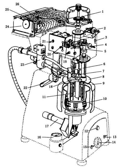 5.7.7 關(guān)閉電源。將攪拌器與傳感豎軸外開,將冷卻套桿提升至最高處,然后壓下升降柄抬起儀器上半部并使向右轉(zhuǎn)動(dòng) 90°。