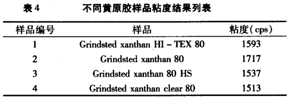 1%黃原膠溶于 1% 氯化鉀溶液,25℃,粘度測(cè)試結(jié)果,見(jiàn)表 4。