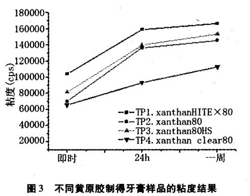 由圖 3 可知 ,不 同黃原膠制得 的牙膏樣 品粘度順序 :TPI—xanthan?。龋桑裕牛兀福埃?TP3 一xanthan?。福埃龋樱?TP2 一xanthan80> TP4 一xanthan?。悖欤澹幔颍福?。