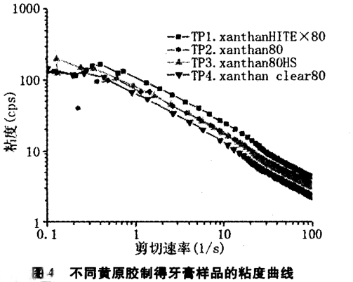 [3]。 圖 4 采用對(duì)數(shù)坐標(biāo),顯示了不同牙膏樣品的粘度曲線。