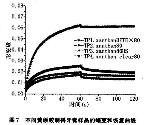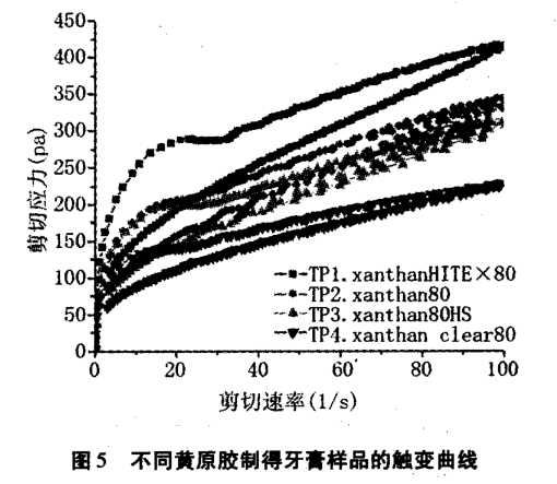 圖 6采用了控制應(yīng)力模式, 屈服應(yīng)力大小為 :TP1>TP2/TP3 > TP4。 屈 服應(yīng)力越小,在一定的剪切應(yīng)力作用下更容易流動(dòng),說(shuō)明在實(shí)際生產(chǎn)中,4 一xanthan?。悖欤澹幔颍福?表現(xiàn)為樣品更容易運(yùn)輸, 洗刷分散性更好,更容易從牙膏管中擠出。