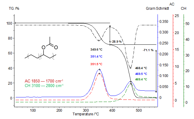 在下圖中顯示了 TGA 曲線(黑色),DTGA 曲線(黑色點劃線)和 Gram-Schmidt 譜圖(藍色)。另外兩個的提出曲線(吸收強度隨溫度變化曲線;紅線和綠線)和DTGA曲線有很好的相關(guān)性。在 350°C 的第一個失重步驟是由于乙烯的揮發(fā)(紅色曲線)。在第二個失重步驟中,乙烯已經(jīng)完全揮發(fā)。綠色的曲線表示了由于聚合物主鏈分解而釋放出的碳氫化合物的吸收強度變化過程(DTGA 峰值為468°C)