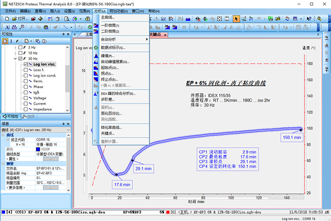 • DEA 變量:顯示離子粘度(ion viscosity),離子電導(dǎo)(ion conductivity),損耗因子(loss factor),介電常數(shù)(permittivity),tgδ 對時間 / 溫度的變化過程