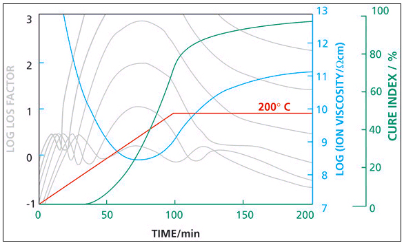 使用 DEA,可以方便地監(jiān)測樹脂在固化工藝過程中的如下參數(shù)及其變化:流動性/粘度變化;起始固化點;凝膠點;后固化過程。借助獨特的離子粘度曲線,該技術(shù)可對材料的固化進程進行實時監(jiān)控與表征,以及計算固化轉(zhuǎn)化率隨工藝進程的變化。