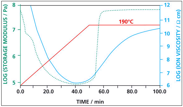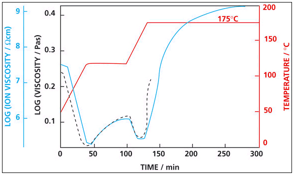 圖中比較了環(huán)氧樹脂-石墨復(fù)合體系固化反應(yīng)的 DEA 曲線與流變測量曲線,最初的 150min 內(nèi)動態(tài)粘度(流變儀數(shù)據(jù))與離子粘度曲線(DEA數(shù)據(jù))幾乎重合,表明了這兩者之間的測量是一致的。從 175°C 恒溫開始,環(huán)氧樹脂膠凝到一定程度后,則無法進行動態(tài)粘度測量(超出流變儀量程)。而隨著固化進程可以繼續(xù)得到離子粘度曲線,甚至在材料固化進入堅硬的玻璃態(tài)后仍能測量。可見,DEA是唯一能夠監(jiān)測固化全過程的方法。