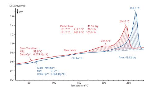 圖中顯示了看似相同的兩種顆粒的 DSC 曲線,樣品為 PA66,分別在不同時間交付(以 20K/min 的速率降溫后二次升溫)。藍色曲線(舊樣)上在 63°C 出現玻璃化轉變,263°C 出現熔融峰,均為 PA66 的典型表現。在新料(紅色曲線)上則出現了雙峰,峰值溫度為 206°C 和 244°C。這表明新料中可能存在與 PA66 共混的第二種聚合物。