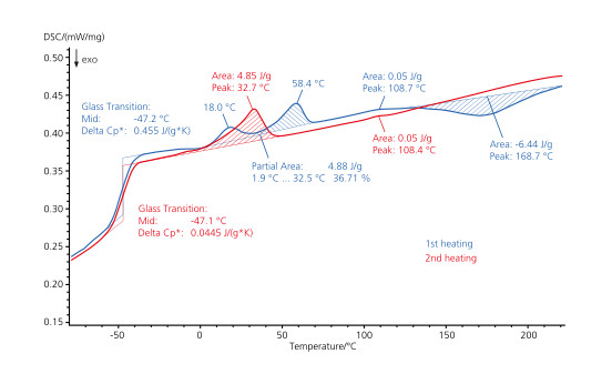 右圖所示為 SBR 橡膠樣品在 -100℃ 到 220℃ 間的兩次升溫曲線,兩次升溫過程中都測得 -47℃(中點)的玻璃化轉變,且 0℃ 到 70℃ 間都有個較寬的吸熱峰,猜測為添加劑的熔融。僅在一次升溫過程中檢測到峰值為 169℃ 的放熱峰,為彈性體后固化過程。