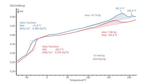下圖為熱塑性聚氨酯(TPU)樣品的測試結果。一次升溫過程中,玻璃化轉變出現在 -42°C,為樣品中鏈段的軟化過程。一次升溫過程中在 100°C 到 210°C 有兩個吸熱峰,二次升溫過程中只檢測到其中一個由熔融(熱塑性組分)引起的可逆轉變(7.40J/g),不可逆轉變的峰(207°C)為易揮發(fā)組分或添加劑的揮發(fā),這種揮發(fā)導致玻璃化轉變溫度升高,二次升溫過程中檢測到玻璃化轉變溫度為 -28°C。