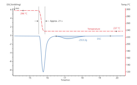 DSC 214 Polyma 配合 IC70 機械制冷,測試 PA66 GF30(30%wt 玻璃纖維)的等溫結晶過程。較低的爐體熱質量,使得爐腔內部可在幾秒內實現 60℃ 的降溫。在這個前提下,才有可能將 PA66 的結晶過程(17min 附近的結晶峰)和溫度調整引起的曲線波動(15.4min 至 16min 之間的曲線波動)分開。同時從溫度曲線可見,在急速降溫時溫度過沖極小,說明 DSC214 Polyma 具有杰出的冷卻性能。