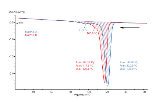 除了峰值為 121℃(藍色曲線)和 118℃(紅色曲線)的主峰外,還有 97℃ 的峰(藍色曲線)和 107℃ 的肩峰(紅色曲線),小的吸熱峰說明材料中還存在另外一種組分,材料 A 中的這一組分導致了較早的成核過程。