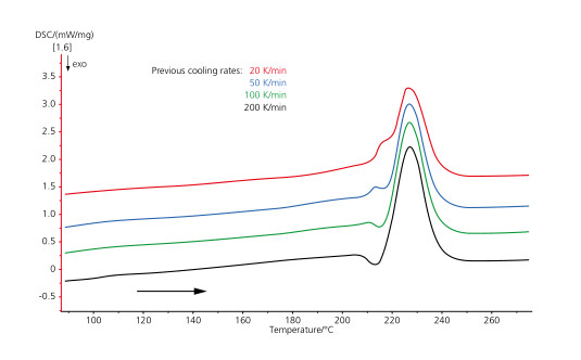 本例顯示的是含 30%wt 玻璃纖維的PBT材料,以多種不同的降溫速率(20K/min到200K/min)冷卻后的升溫曲線。