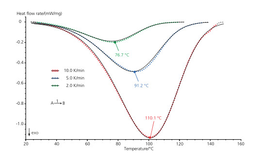 本例研究雙組分環(huán)氧粘合劑的固化過程,將三個樣品以不同速率(2K/min、5K/min 和 10K/min)升溫至 200℃,固化反應的峰值溫度隨升溫速率提高而升高。單步反應的動力學模型與試驗曲線基本重合,相關系數高于 0.999。因此,此模型可用于對等溫和用戶自定義的溫度程序下的反應進行預測。