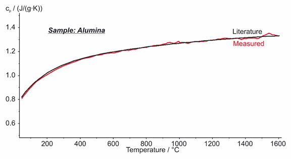 圖中所示為在室溫至1600°C的溫度范圍內(nèi)對多晶氧化鋁樣品的比熱測量結(jié)果,同時給出了純氧化鋁的比熱文獻值曲線。能夠清楚地看到在文獻值與測量值之間差別很小,最大偏差在 2% 范圍內(nèi),這充分顯示了 DSC 404 F1 Pegasus® 的優(yōu)異的比熱測量精度。