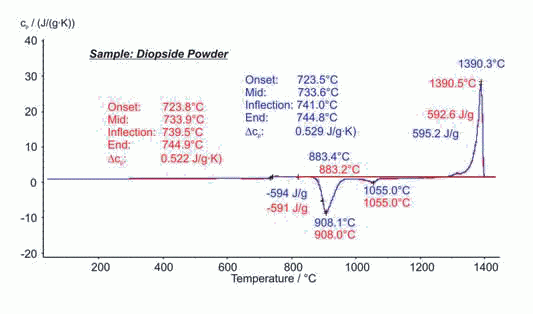 圖中顯示的是透輝石玻璃粉末兩次測試的結(jié)果。玻璃化轉(zhuǎn)變發(fā)生在723°C~745°C之間,重結(jié)晶出現(xiàn)在883°C(起始點),熔融出現(xiàn)在1390°C(主峰溫度)。兩次測試分別取樣,得到的數(shù)據(jù)包括特征溫度和相應(yīng)的熱焓計算都吻合的很好,而且兩次測試過程中樣品比熱也基本無差別。這說明DSC 404 F1 Pegasus? 具有非常出色的穩(wěn)定性和測試重復(fù)性。
