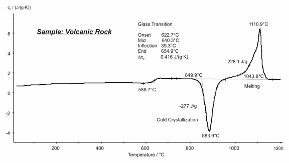 巖石作為一類化學(xué)組成非常復(fù)雜的天然材料的泛稱,一般很難進行分析。這類材料通常是多種多樣的氧化物,硫酸鹽或碳酸鹽的混合物?;鹕綆r通常由熔融巖漿凝固而成,其主成分為多種氧化物。本例顯示了對于某種巖石材料的 DSC 測量結(jié)果。玻璃化轉(zhuǎn)變發(fā)生在 623°C 至 655°C 之間,在 884°C 與 1111°C 分別檢測到了冷結(jié)晶與熔融峰(均取峰值溫度)。冷結(jié)晶的放熱熱焓與熔融的吸熱熱焓相近,證明了該混合物接近于完全的無定形材料。