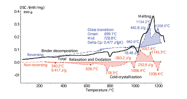 溫度調(diào)制 DSC(TM-DSC)是傳統(tǒng)上常用于測試聚合物低溫應(yīng)用的工具。STA 449 F1 Jupiter® 和 DSC 404 F1 Pegasus® 是市面上最早實現(xiàn)高溫溫度調(diào)制的儀器。下圖所示為絕緣礦物纖維的測試結(jié)果。在 DSC 總熱流曲線中,馳豫、氧化和玻璃化轉(zhuǎn)變是重疊的。只有從分離得到的 DSC 可逆熱流曲線上,才能準確分析樣品的玻璃化轉(zhuǎn)變。
