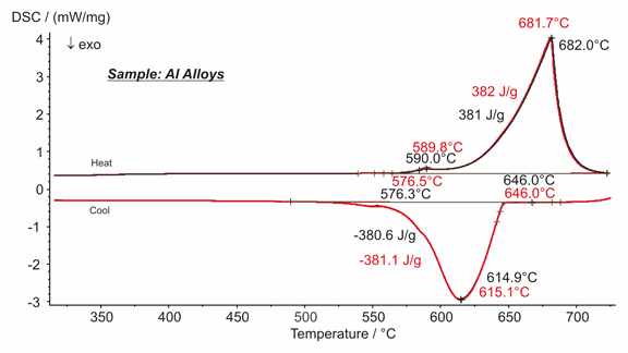 對(duì)某一鋁合金材料(Al-Mg-Si)取兩片樣品,使用 DSC 404 F3 Pegasus ® 進(jìn)行了測(cè)量,在升溫與降溫曲線中可以清晰地看到合金的熔融與凝固過(guò)程。兩片樣品的測(cè)試結(jié)果幾乎完全吻合,不管對(duì)于升溫與降溫,其特征溫度(起始點(diǎn),峰值)差別均在 0.3K 以內(nèi)。峰面積的差別均小于 1%。兩次測(cè)量結(jié)果間的良好的一致性表明了 DSC 404 F3 Pegasus® 的測(cè)量重現(xiàn)性。