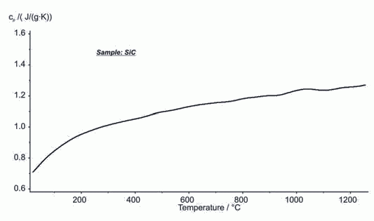 碳化硅在很多領(lǐng)域中都有應(yīng)用,在鋼鐵企業(yè)中它被用于汽車排氣系統(tǒng)的過(guò)濾裝置中,也用作離合器以及高溫爐體的加熱元件中。圖中顯示的是碳化硅在室溫到1200°C 范圍內(nèi)的比熱測(cè)試數(shù)據(jù)。圖中碳化硅的比熱增加趨勢(shì)符合德拜原理,在高溫處比熱表現(xiàn)為微弱的溫度依賴性,遵循杜隆—珀替定律。