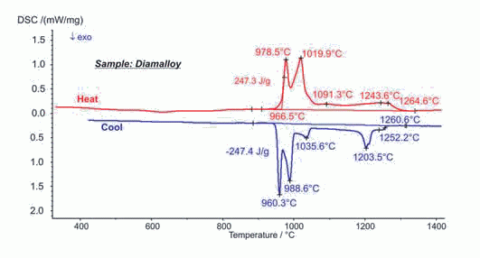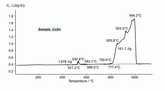 青銅合金是一種銅基合金,在古代人們就開(kāi)始用它作為武器、容器或其他的金屬制品。今天它還經(jīng)常被做成軸承和彈簧元件。根據(jù)合金中錫的含量和添加劑的比例不同,合金的熔融行為會(huì)發(fā)生改變。圖中的合金樣品是用在滲透工藝中的。在521°C和568°C(起始點(diǎn))范圍內(nèi)樣品發(fā)生固相相變。熔融出現(xiàn)在777°C,整個(gè)熔程跨度超過(guò)200K,994°C后樣品完全熔化。