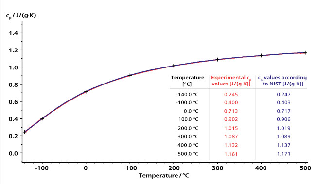 藍寶石是比熱測試時常用的參比樣品,比熱值已知。DSC 3500 Sirius 測試了藍寶石在 -140℃ 到 500℃ 范圍內的比熱,并與 NIST 提供的理論值進行比較。在測試的溫度范圍內,實測值與理論值的最大偏差為 0.8%。