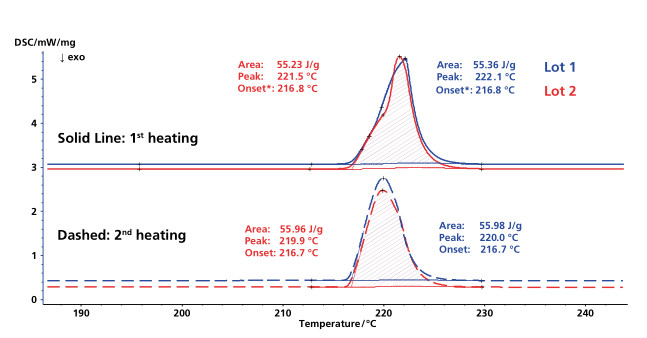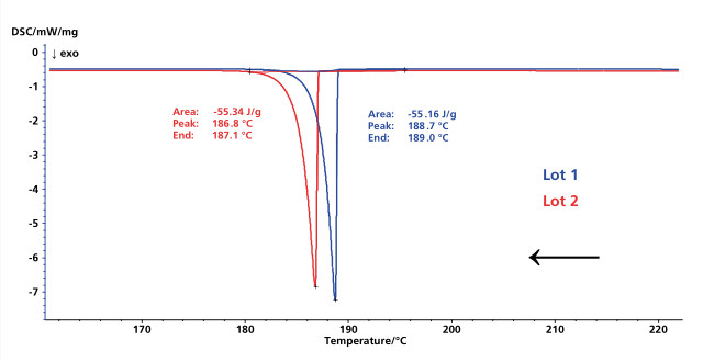 然而,2 個樣品的降溫曲線(一次升溫后降溫)卻不盡相同,Lot1(藍色曲線)結晶溫度為189℃(終點),Lot2(紅色曲線)結晶需要更大的過冷度,起始結晶的溫度低于 Lot1,終止點溫度為 187℃。結晶溫度的差異與樣品中的雜質含量不同有關。這個例子說明 DSC 3500 Sirius 可以對樣品進行快速的質檢。此外,還說明降溫測試的重要性,尤其是樣品的升溫曲線相近時。
