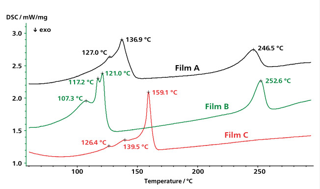 DSC 測試 3 種不同聚合物薄膜包裝袋。樣品質量:0.692mg(樣品 A),1.45mg(樣品 B),0.919mg(樣品 C)。坩堝:Al,加蓋扎孔。