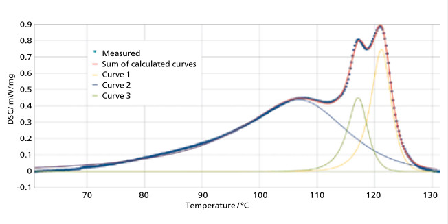 右圖為采用峰分離軟件將 B 樣品在 100℃ 到 125℃ 之間的峰進行分離后的結果,可以看出,原來重疊的峰被分離成 3 個獨立的峰,峰值溫度分別為 107℃、117℃ 和 121℃,且實測曲線(點畫線)與 3 條計算曲線擬合成的總曲線(紅色)幾乎完全重合,說明分離效果很好。峰分離有助于準確計算單個峰的峰值和峰面積。
