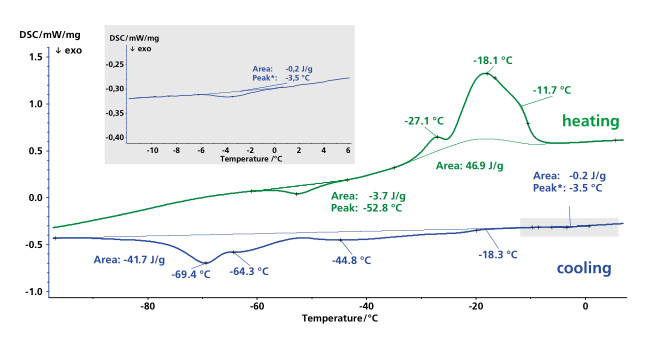 DSC 3500 Sirius 同樣適用于食品行業(yè)的研究。這里我們給出了菜籽油的 DSC 測量結果。樣品首先冷卻到 -150℃,再加熱至 40℃。冷卻速率為 10K/min,由于油的結晶,在 -18℃ 開始出現(xiàn)放熱峰。曲線在 -45℃,-64℃,-69℃ 出現(xiàn)最小值,顯示菜籽油主要成分為油酸、亞麻油酸和亞麻酸等各類飽和與不飽和脂肪酸。-4℃ 的放熱峰可能為添加劑的結晶。在隨之的升溫過程中,在 -53℃ 出現(xiàn)冷結晶峰,接著是菜籽油各組分的熔融峰(峰值溫度 -27℃,-18℃ 與 -12℃)。